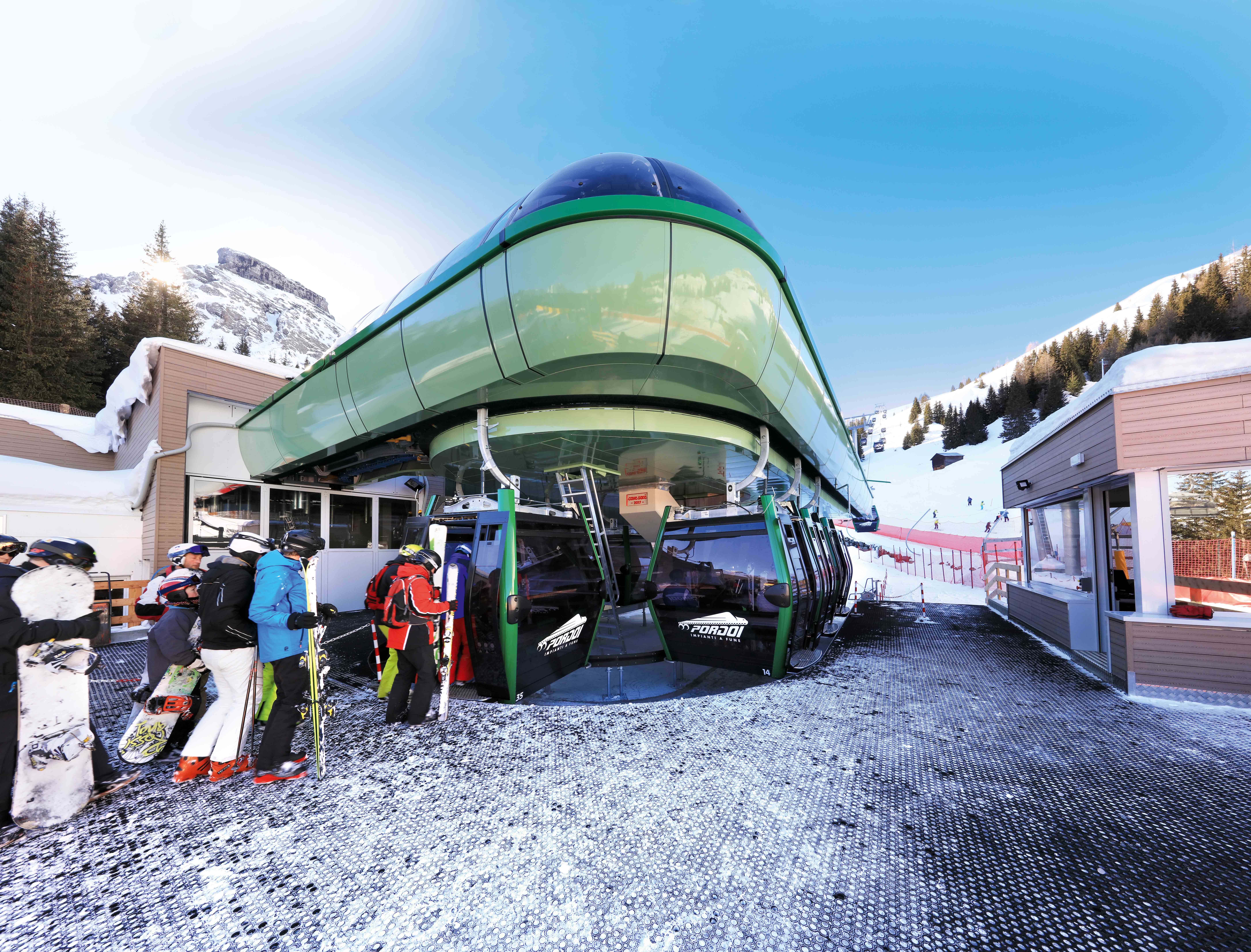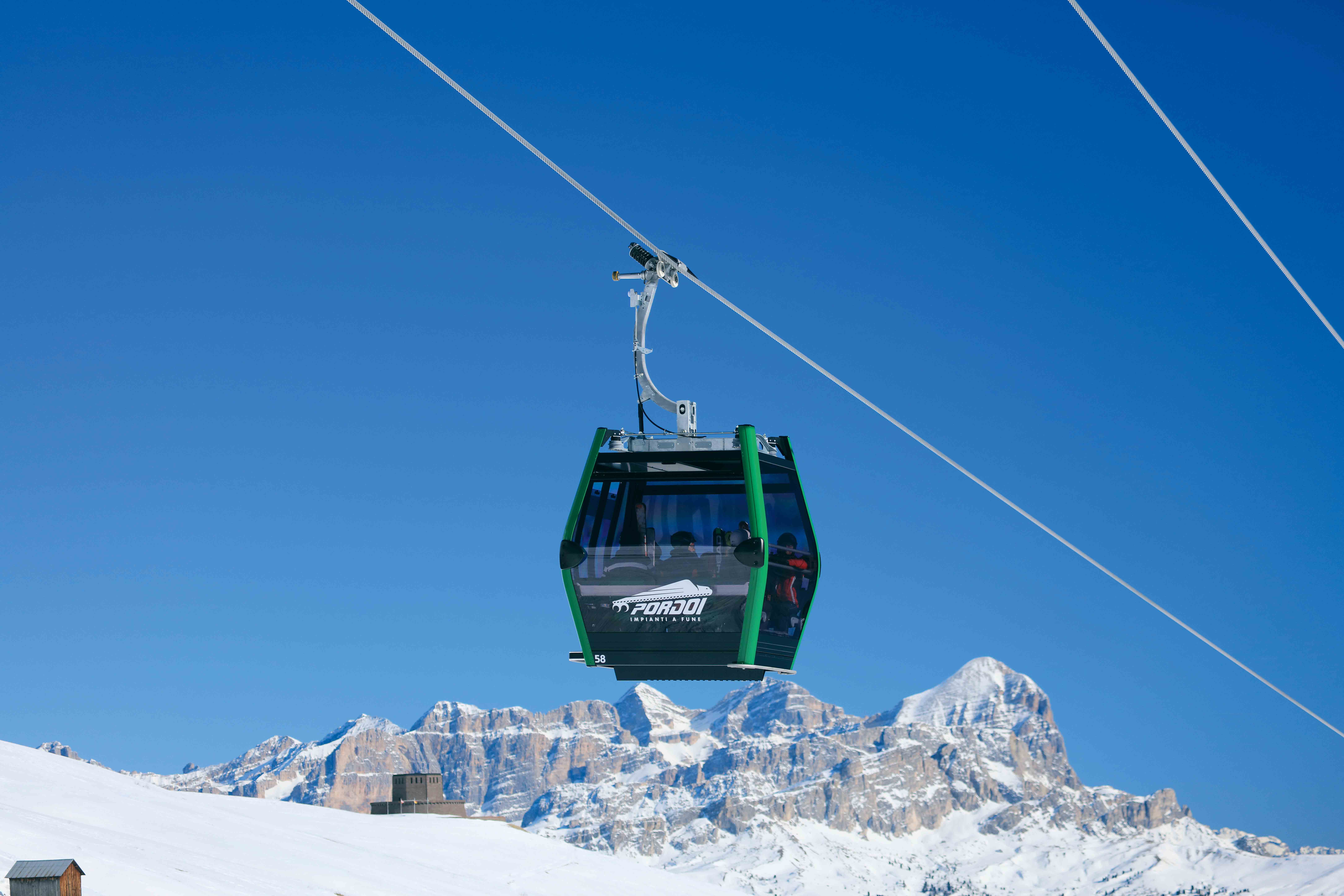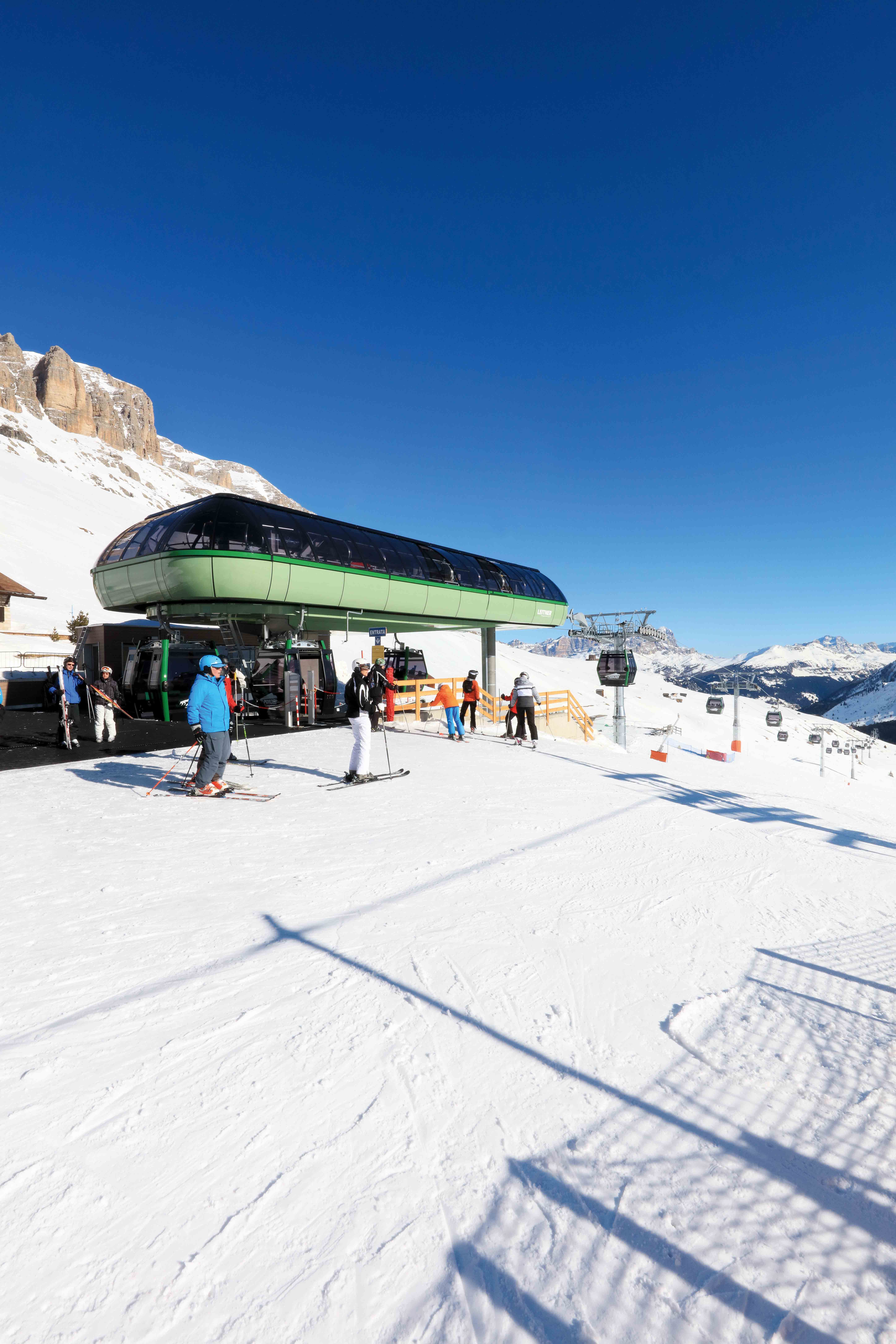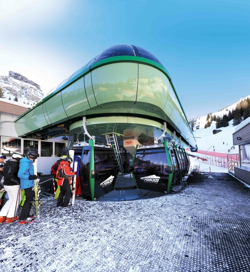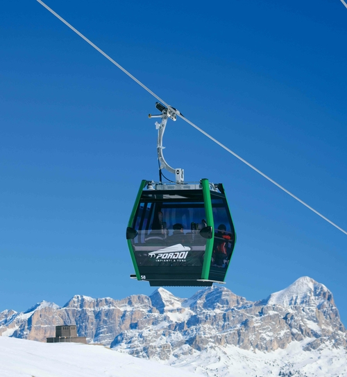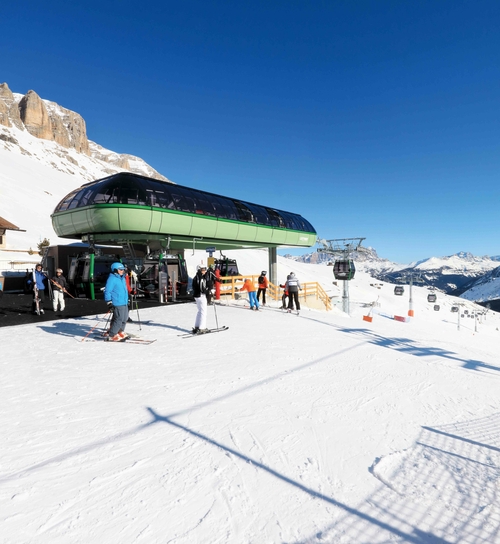 The gondola lift at Passo Pordoi replaces a 4-seater chairlift from 1998, resulting in a clear capacity boost. The Diamond XLine cabins offer passengers plenty of space and allow them to keep their skis with them in the cabin. In the bottom station, the vehicles can be slowed down significantly for more comfortable boarding, as the station length has been extended. The ropeway is equipped with LEITNER DirectDrive.
