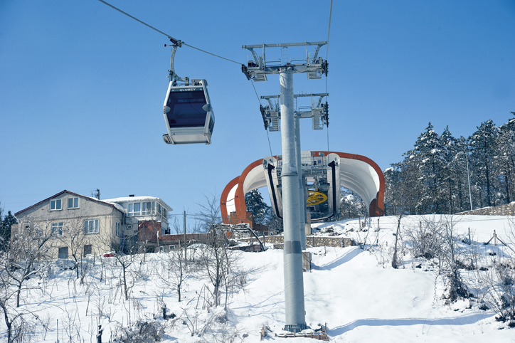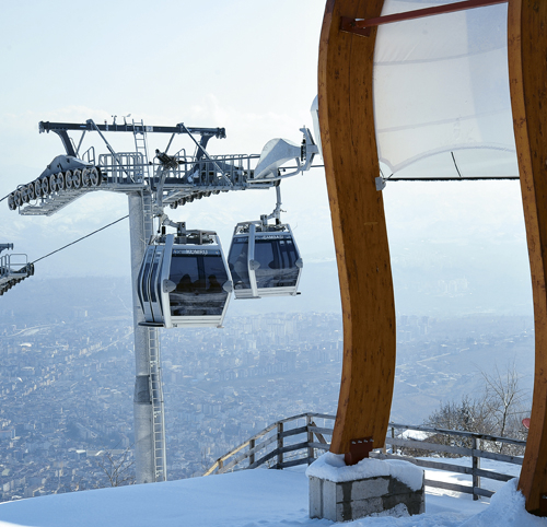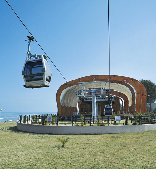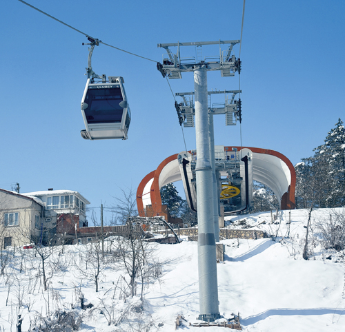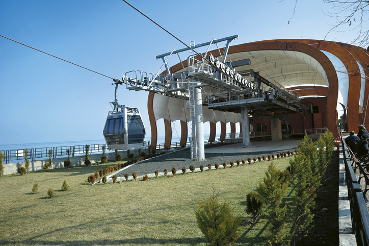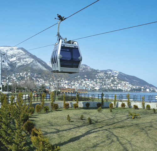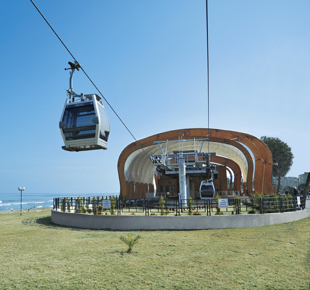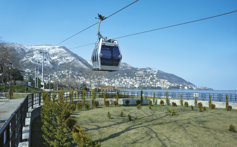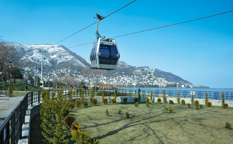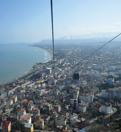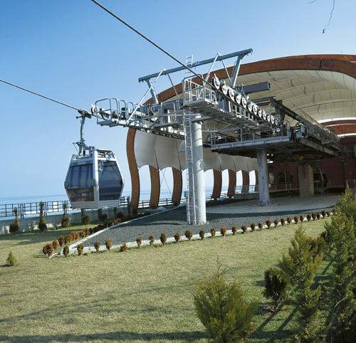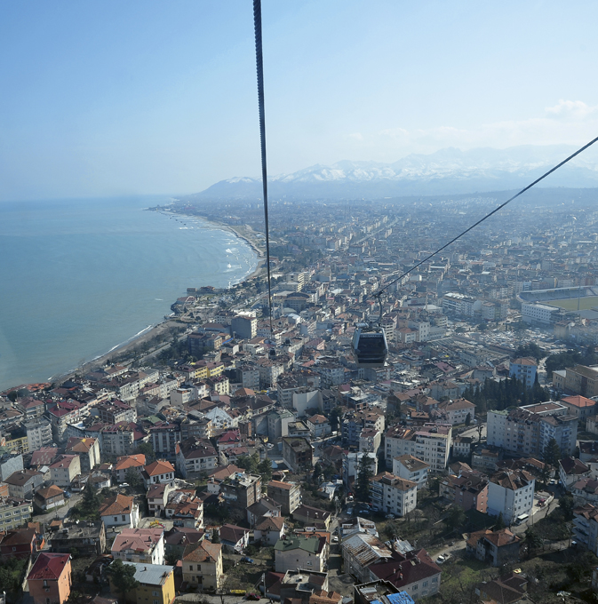 The city of Ordu is one of the most important commercial centers in Turkey, and the largest producer of hazelnuts in the world. The bottom station for the ropeway is located right on the beach. Since summer 2011, an 8-person ropeway has been alleviating the traffic on the streets. The gondola lift is remarkable not only for its amorphous station buildings; its technical sophistication is also displayed in the unique span length of 900 meters. The new ropeway runs from the beach and city district to the local recreation area of Boztepe, which is situated 300 meters higher up.