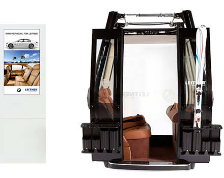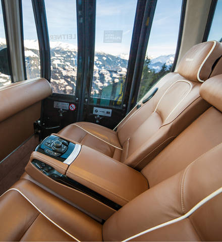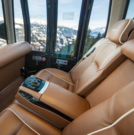 Una cabina ultramoderna SIGMA Diamond de LEITNER, para disfrutar de un ascenso relajado a la montaña. El interior procede de BMW Individual y está formado por asientos de cuero con función de masaje y el sistema multimedia del modelo BMW Serie 7 Limousine. El proyecto "BMW Individual for LEITNER" presenta la que con toda probabilidad es la forma más exclusiva de vivir el invierno en los Alpes. Los asientos de cuero auténtico de color marrón Amaro, que cuentan con función de masaje y calefacción; el revestimiento del techo de la cabina en Alcantara Platinum; la consola frontal de cuero y los posavasos y posabotellas; todo ello permite satisfacer las necesidades de los clientes más exigentes. Gracias al sistema multimedia accionable directamente a través del botón de BMW iDrive situado en el reposabrazos central, a la pantalla y a una excelente calidad de sonido, esta cabina VIP supera todas las expectativas.