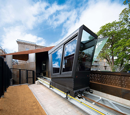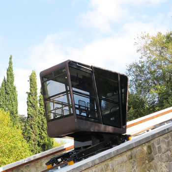 El ascensor inclinado LEITNER: utiliza la tecnología de base del ascensor vertical. El ámbito mejor de aplicación está representado por trazados cortos y lineales. Gracias a la automatización integral del sistema, la instalación no requiere la intervención de personal de maniobra.