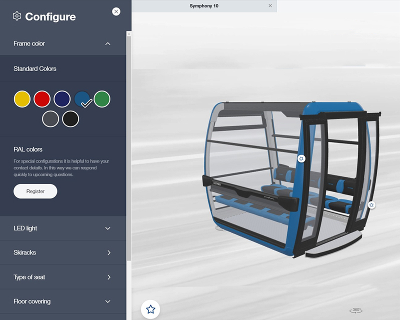 Avec l'outil de configuration numérique LEITNER il est possible de créer un projet de téléphérique grâce à différentes options individuelles disponibles et donc de combiner, au choix, divers éléments. Le logiciel gratuit très simple à utiliser guide l'utilisateur, pas à pas et grâce à de simples menus, jusqu'à la création du projet de son choix. Il faut d'abord sélectionner le produit, l'outil permettant pour le moment de faire un choix entre la cabine luxe Symphony 10, le siège Premium EVO ainsi que les bâtiments pour la gare. L'étape qui suit permet de personnaliser des éléments visuels comme le coloris ou l'éclairage. Il est également possible de définir certains détails techniques comme, par exemple, le type de porte-skis. De nombreuses possibilités de combinaisons différentes sont accessibles afin de pouvoir répondre le plus globalement possible aux souhaits et aux besoins individuels.