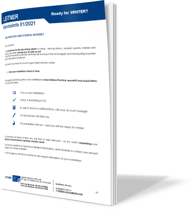 Per avere successo a lungo, un impianto per il trasporto di persone deve funzionare sempre senza intoppi e garantire il rispetto di tutte le misure di sicurezza necessarie, e ciò per tutta la durata della sua vita tecnica. Per questo motivo offriamo soluzioni realizzate su misura per le Vostre esigenze di manutenzione e di cura dell'impianto e Vi accompagnamo lungo tutto il ciclo di vita dell'impianto con una serie di prestazioni che coprono ogni fabbisogno: dall'installazione e messa in esercizio, ai corsi di formazione, fino agli ammodernamenti e alle revisioni. Un intelligente insieme di interventi di manutenzione preventiva, conservativa e correttiva garantisce risultati ottimali quanto a efficienza, economicità e durata dell'impianto.