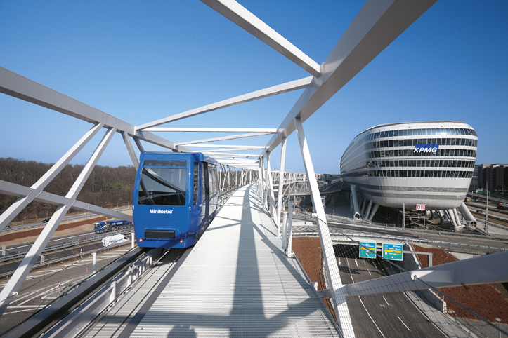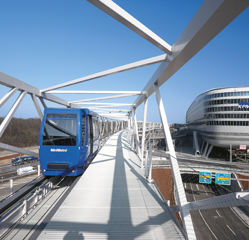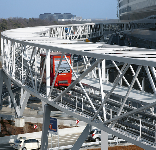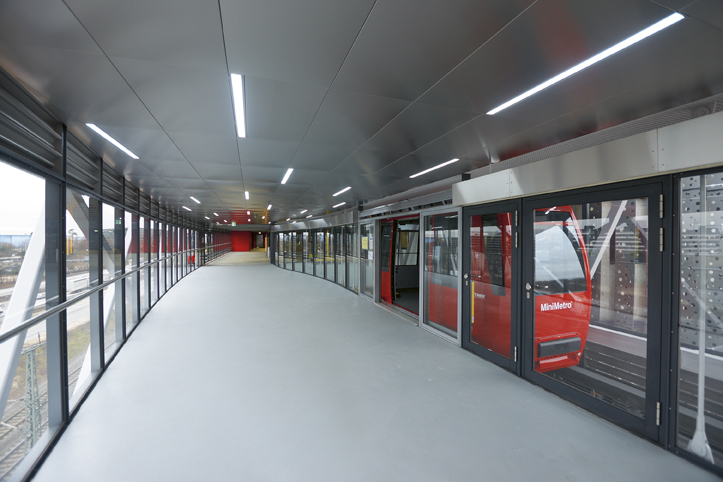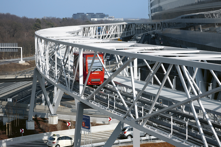 Trecento metri da percorrere in poco più di un minuto, viaggiando in quota su una struttura che a 16 metri di altezza si caratterizza per leggerezza e design; due le cabine da 50 persone. Un viaggio che conduce nella “pancia” di “The Squaire”, una futuristica struttura lunga 660 metri con oltre cento ascensori ad animare il suo corpo. Il complesso è in grado di ospitare nei suoi complessivi 140 mila metri quadrati, uffici, centri commerciali, ristoranti e hotel di lusso. Funzionalità ma anche armonia, grazie alle ampie oasi verdi che si inseriscono alla perfezione in questo concentrato di modernità.