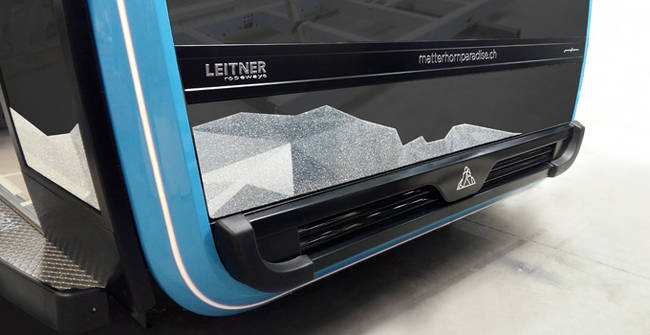 Als Dreiseilumlaufbahn ist der „Matterhorn glacier ride“ bestens für alle Wetterlagen gerüstet. Die 3S Technologie bietet höchste Windstabilität und verfügt durch die im Vergleich zu anderen Anlagentypen längeren Spannfelder die bauliche Grundlage, um ein Projekt in diesem Gelände zu realisieren. Die hohen Maßstäbe spiegeln sich bei diesem Ausnahmeprojekt auch im Design wieder. So sind die 25 Kabinen der ganzjährig betriebenen Bahn mit ihren jeweils 28 Sitzplätzen in der Premiumversion mit extrabreitem Einstieg, Rundumverglasung, großflächigen Panoramafenstern und den Materialien Leder und Alcantara ausgeführt. Für die Gäste eröffnet sich während der Fahrt ein völlig neuer Rundumblick auf die Gletscherlandschaft. Die Symphony-Kabinen „aus der Feder“ der italienischen Designschmiede Pininfarina sorgen am Matterhorn zugleich für eine weitere Weltneuheit. So veredeln erstmals in der Geschichte von LEITNER ropeways tausende Swarovski® Kristalle die Außenseite von vier der 25 Kabinen und zieren zudem die Beschriftung der komfortablen Sitze. Dank einer weiteren technischen Besonderheit offenbaren diese Kabinen während der neunminütigen Fahrt einen spektakulären Blick: Nach drei Minuten, auf einer Höhe von 170 Metern über Grund, klärt sich ihr bis dahin trüber Glasboden und gibt in Sekundenschnelle einen grandiosen Blick auf die Gletscherlandschaft frei. Möglich wird dies durch ein aktives Verbundglas, das unter dem Einfluss von Strom von milchig-weiß auf durchsichtig wechselt.