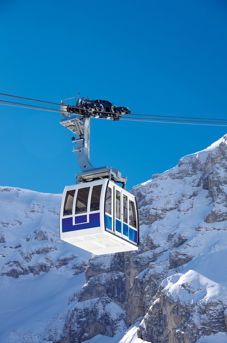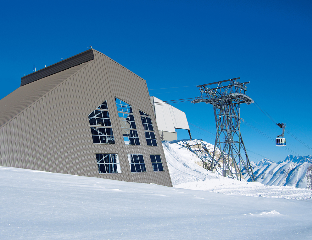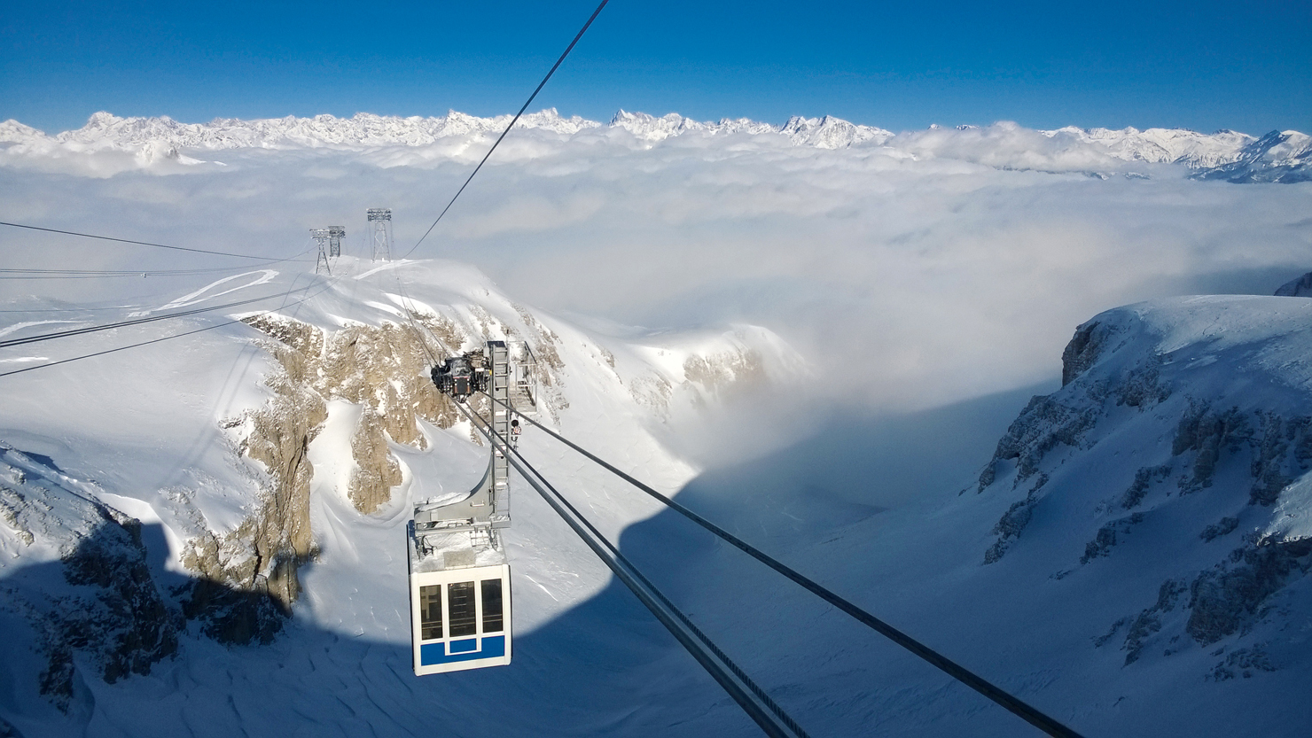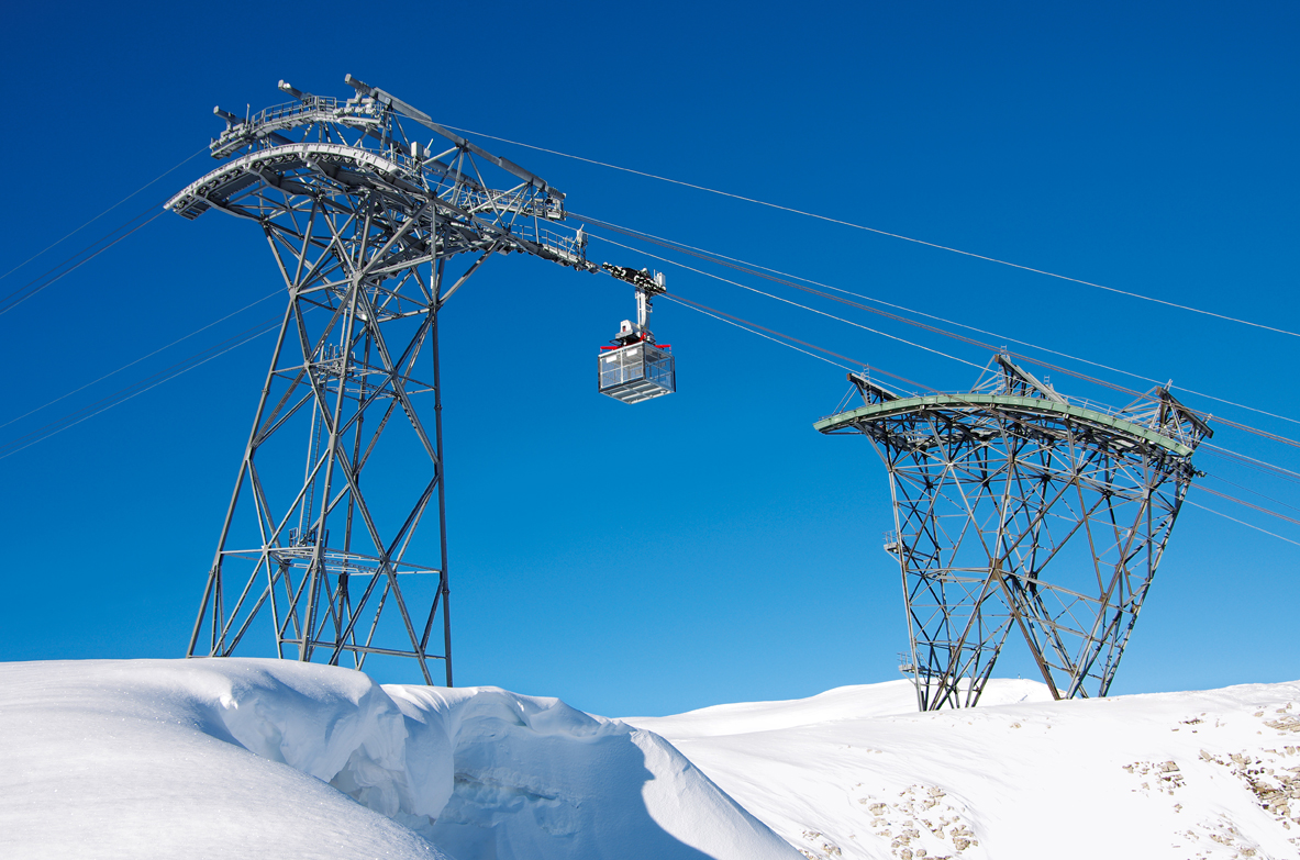 Im Skigebiet Le Dévoluy in den Hautes-Alpes schafft diese Pendelbahn, eine Kombination aus Personentransport und Materialseilbahn, eine erheblich bessere Verbindung zum Pic de Bure und zum Observatorium.